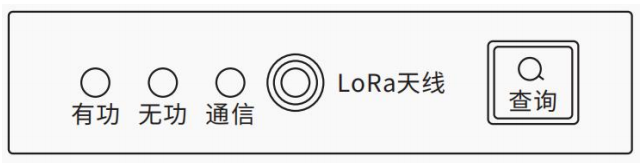 面板下方從左到右分別設有有功脈沖指示燈、無功脈沖指示燈、通信指示燈、LoRa 天線座、查詢按鍵。